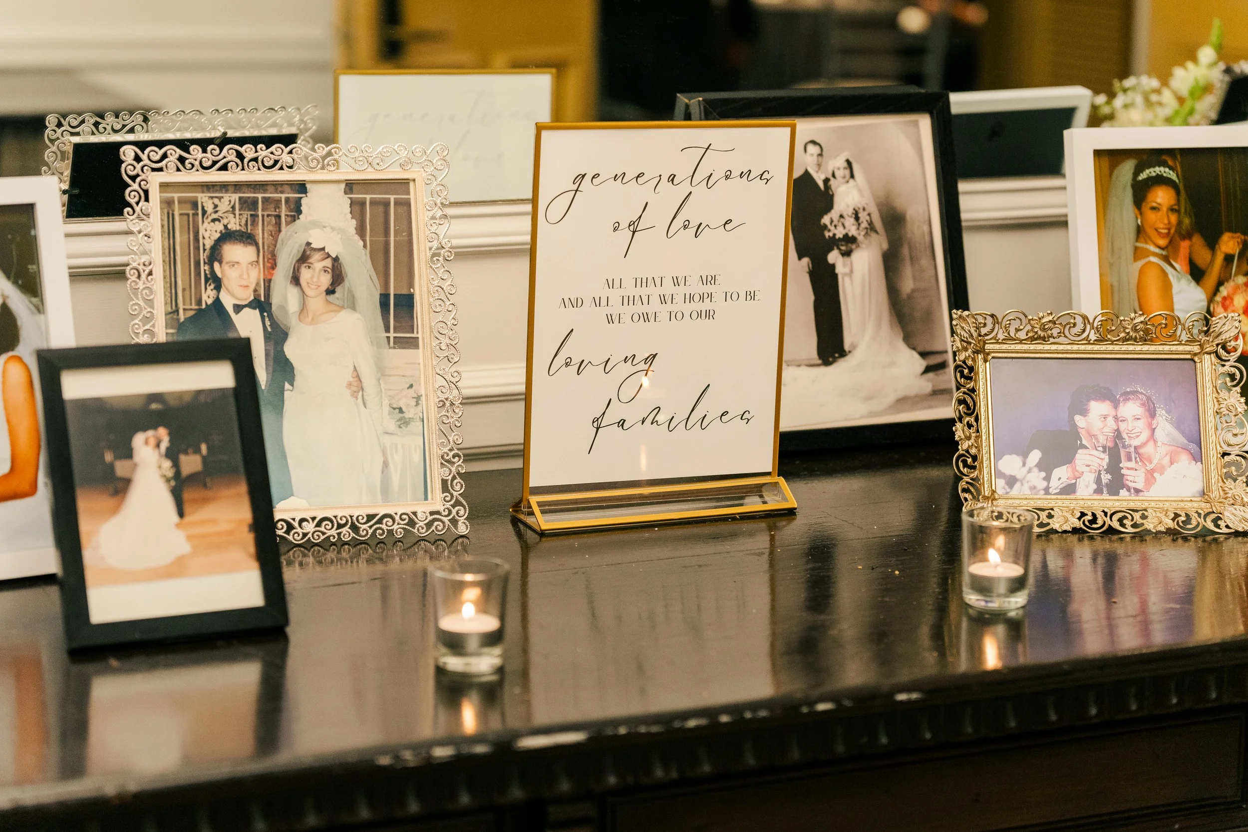 Instead of a traditional memorial table, they created a display celebrating the love stories that came before theirs. This thoughtful tribute highlighted the relationships that shaped their lives and connected their families.